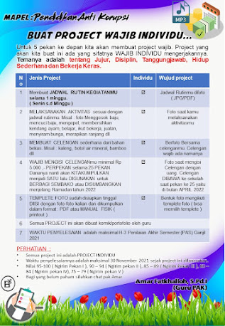Oleh karena itu dalam pembelajaran Pendidikan Anti Korupsi (PAK) ini, saya menerapkan sebuah project individu dengan memberikan penugasan kepada peserta didik untuk :